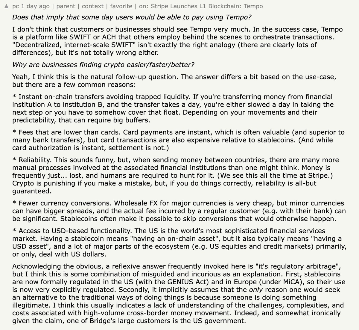 But that assumes global payment companies don’t have anything to say about that. Not to be outdone, Stripe also announced its own stablecoin-focused chain called Tempo in partnership with a who’s who of global AI, e-commerce and financial institutions: OpenAI, Shopify, Anthropic, Visa, Revolut, Coupang, Deutsche Bank, DoorDash, Lead Bank, Mercury, NuBank, and Standard Chartered, among others. As much as your author would like to pretend he is a global payments expert, he sadly is not, so instead we’ll just let Stripe’s CEO, Patrick Collison, explain why one of the top payments companies in the world sees value in adopting stablecoin technology: