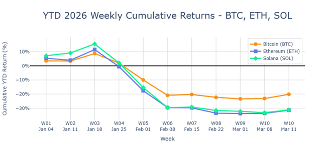 The first two months of 2026 tested conviction across the board. As of March 12, major crypto assets remain materially lower year-to-date: