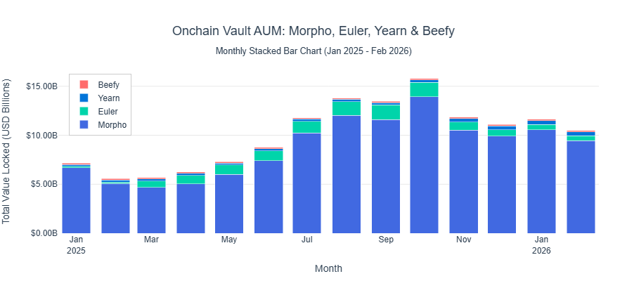 On-chain vault AUM continues to expand. TVL is materially higher than a year ago, rising from roughly $5.9 billion in early 2025 to about $10.3 billion by February 2026, even after a post-peak pullback following the September high. The composition also matters: growth has been concentrated in Morpho, while smaller venues such as Euler have posted rapid gains off a lower base. Net, on-chain credit capacity is scaling rather than contracting through a weak spot tape.