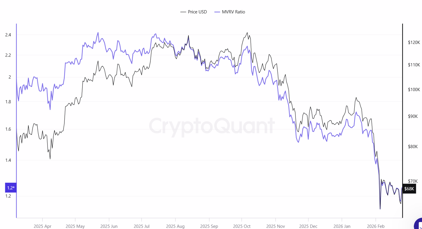 For assets such as Bitcoin that do not generate traditional cash flows, the market often relies on the MVRV ratio to assess valuation relative to aggregate cost basis. While the ratio is not yet in deep undervaluation territory, it has compressed materially from prior highs and now sits near the lower end of its recent historical range. This suggests valuation has reset significantly, even if the market has not yet entered a classic distressed regime.