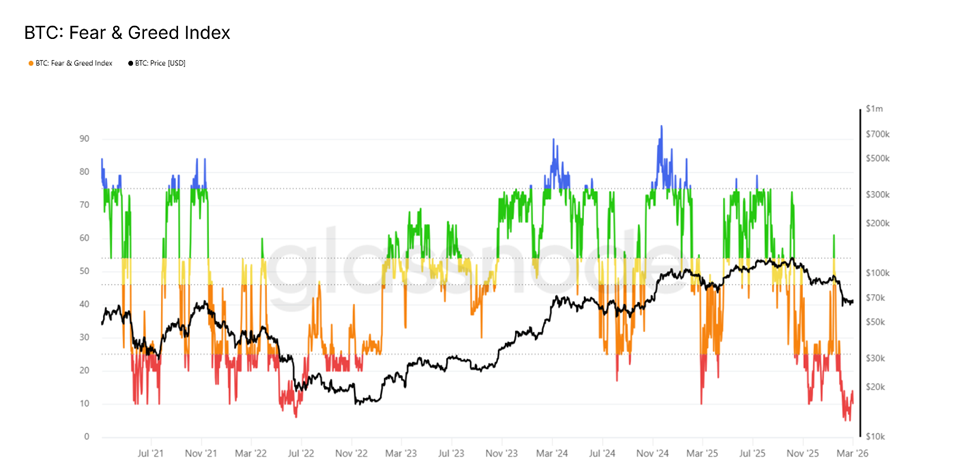 The clearest interpretation is not outright bullishness, but stabilization after forced selling. Historically, such ultra-low readings have tended to coincide with widespread panic, washed-out positioning, and, at times, local bottoms or the setup for strong reversals. By early March, the index had recovered modestly but remained in “Extreme Fear” territory, consistent with a market where panic selling appears largely exhausted, even if confidence has not yet returned.