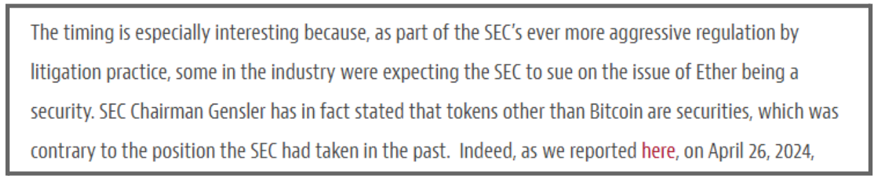 In comparison, the SEC was still unclear about whether they deemed ETH (the 2nd largest digital asset, ~$400B) as a commodity or security until summer 2024 when they surprised the market by approving spot ETH ETFs, which the market took to implicitly mean ETH too was seen as a commodity. Even then, SEC Chair Gensler frequently equivocated on ETH’s status, and it was not until just this year that the first unequivocal specification of ETH as a commodity was made by the SEC. Keep in mind, throughout much of the last political campaign cycle in the US, prominent Senators (e.g. Warren, Brown) ran entire campaigns around building ‘anti-crypto armies’. In short, the legal standing of digital assets outside of Bitcoin in the US has very much been in flux until just a few months ago. We detailed this confusing regulatory landscape in a newsletter post earlier this summer. This contemporaneous quote from global law firm Baker Mackenzie sums up the inconsistency well: